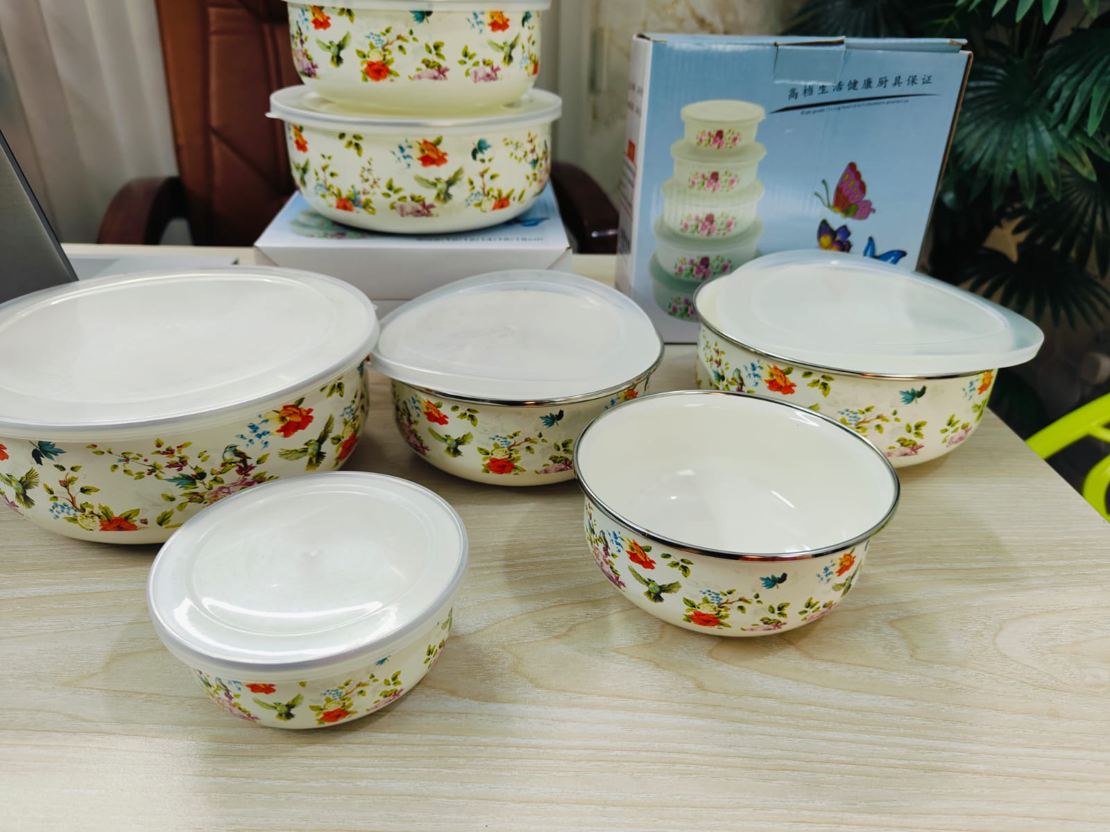This 5-piece enamel bowl set is a beautiful and functional addition to any kitchen. Each bowl includes a matching lid, making it perfect for mixing, serving, and storing a variety of foods. The classic enamel finish offers durability and vintage charm, while the range of sizes makes this set incredibly versatile.